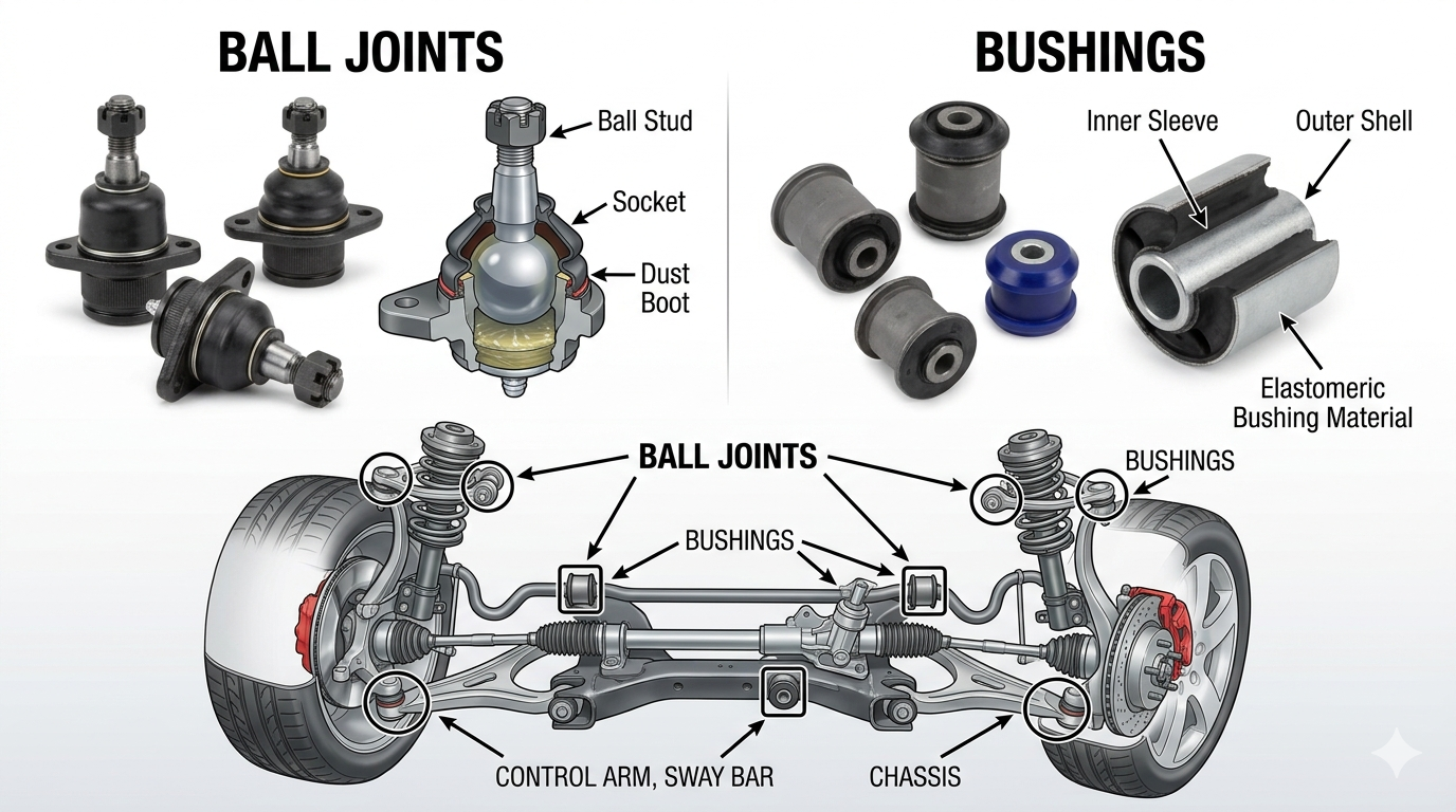 Den praktiske takeaway: inspicere kugleled og bøsninger ved hver dækrotation (hver 5.000–7.500 miles), udskift slidte komponenter i akselpar, følg altid affjedringsarbejdet med en firehjulsopstilling, og vælg komponentkvalitet, der matcher dit køretøjs brugssituation - OEM-gummi til komfortorienterede daglige chauffører, polyurethan til ydeevne eller tunge applikationer.
